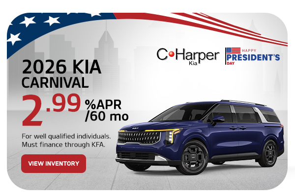26 Carnival---2.9% APR for 60months. -Available on 2026 Kia Carnival for well qualified individuals. Must finance through KFA. Not all will qualify. No downpayment required. Not combinable with other offers. Cost per $1,000 financed is $17.92 per month for 60months. Vehicle shown for illustrative purposes only. Multiple available. See dealer for details. Sale ends 03/02/2026