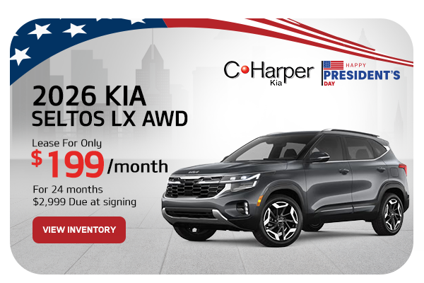 26 KIA SELTOS LX AWD – Lease $199/month, 24 months, 10K miles per year through KFA. $2999down. Plus tax, dealer fees, state fees, and first payment. $0 Security deposit. Must qualify. Residency restrictions apply. See dealer for details. Multiple Available. While supplies last. Vehicle shown for illustrative purposes only. Sale ends 3/02/26