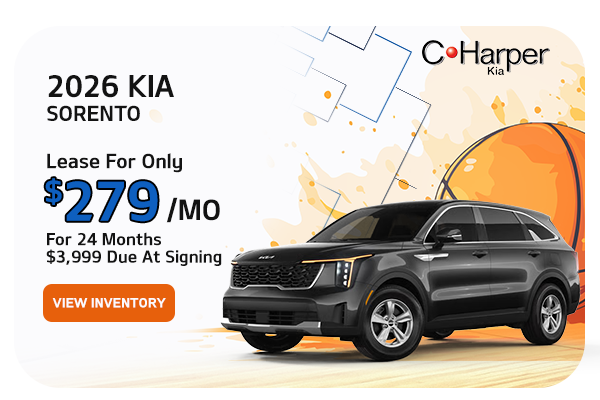 26 SORENTO S AWD – Lease $279/month, 24 months, 10K miles per year through KFA. $3999 down. Plus tax, dealer fees, state fees, and first payment. $0 Security deposit. Must qualify. Residency restrictions apply. See dealer for details. MULTIPLE AVAILABLE. Vehicle shown for illustrative purposes only. Sale ends 03/31/2026