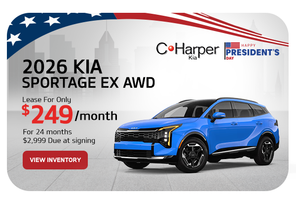 26 SPORTAGE EX AWD – Lease $249/month, 24 months, 10K miles per year through KFA. $2999 down. Plus tax, dealer fees, state fees, and first payment. $0 Security deposit. Must qualify. Residency restrictions apply. See dealer for details. MULTIPLE AVAILABLE. Vehicle shown for illustrative purposes only. Sale ends 03/02/2026