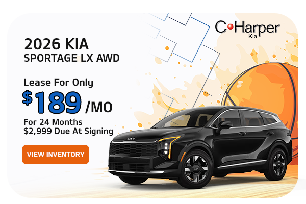 26 SPORTAGE LX AWD – Lease $189/month, 24 months, 10K miles per year through KFA. $2999 down. Plus tax, dealer fees, state fees, and first payment. $0 Security deposit. Must qualify. Residency restrictions apply. See dealer for details. WHILE SUPPLIES LAST. Vehicle shown for illustrative purposes only. Sale ends 03/31/2026